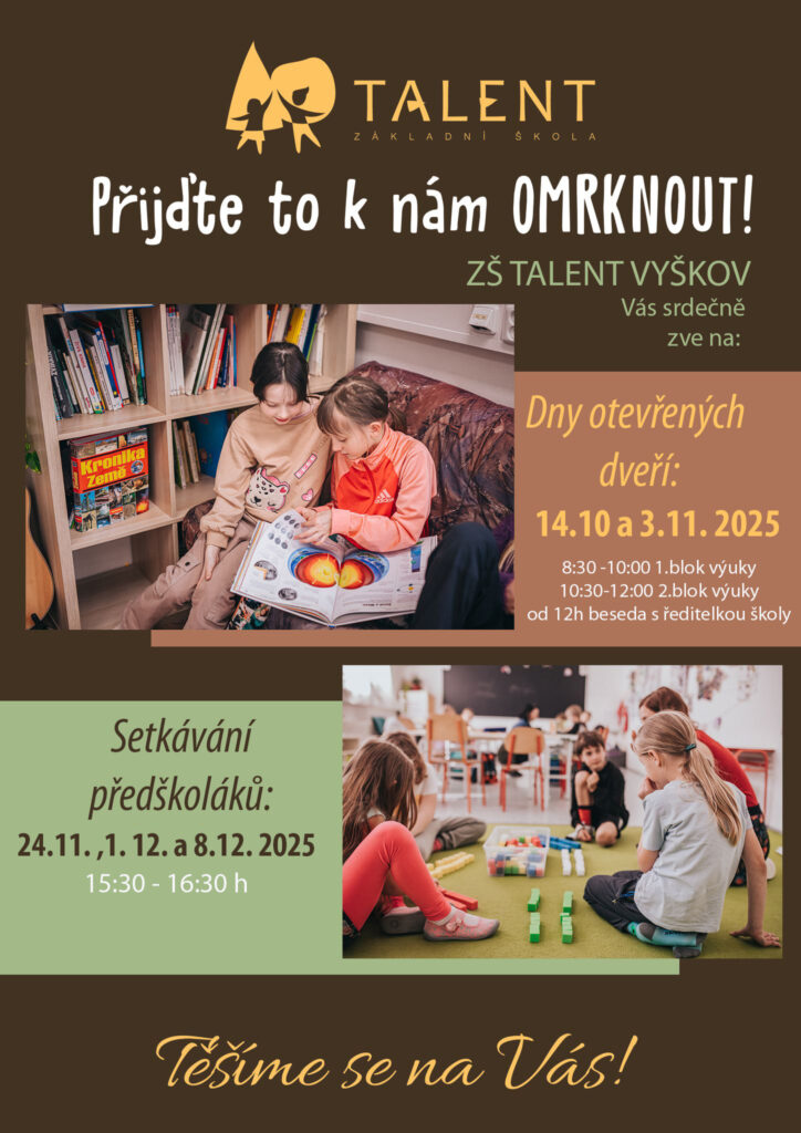 Dny otevřených dveří: 14. 10. a 3. 11. 2025 od 8:30 – do 12 h, ve 12 hodin se uskuteční beseda s ředitelkou
